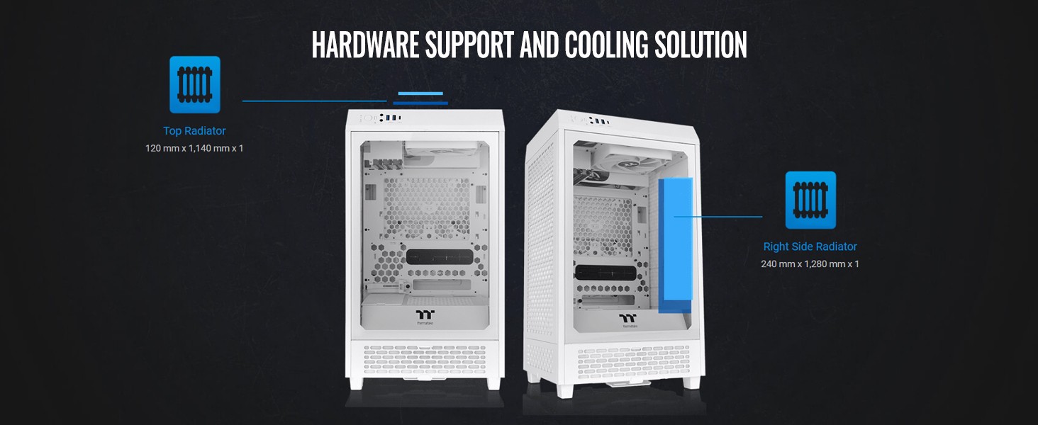 | RADIATOR SUPPORT | Top: 1 x 120mm 1 x 140mmRight Side(AIO): 1 x 240mm, 1 x 120mm 1 x 280mm, 1 x 140mm |